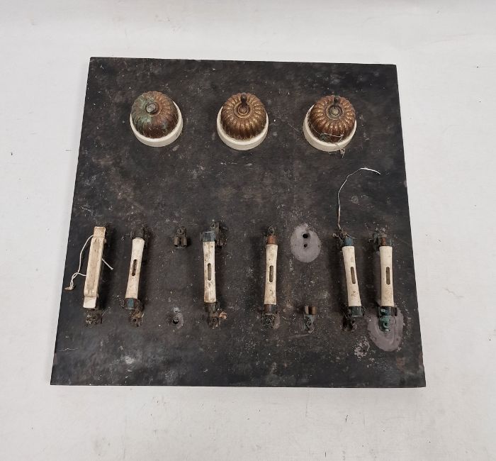 Early 20th century slate mounted panel of switches and ceramic fuses, with three gilt metal jelly-mould shaped switches, 40.5cm square
