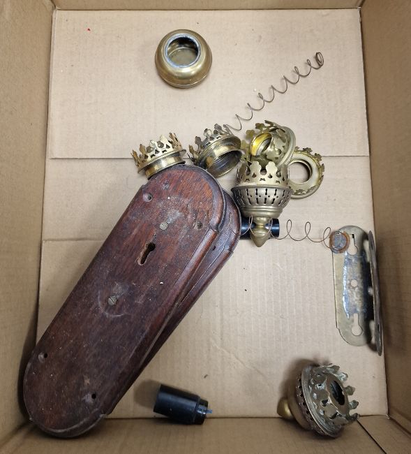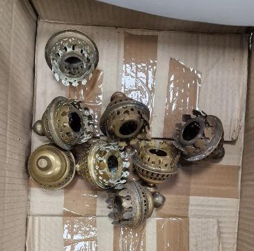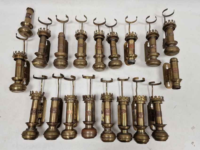 Collection of 'GWR', 'RRC' and 'SRC' brass wall-mounted oil lamps from railway carriages, with associated fittings (damages) (2 boxes)