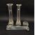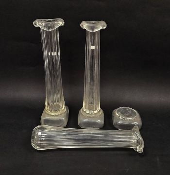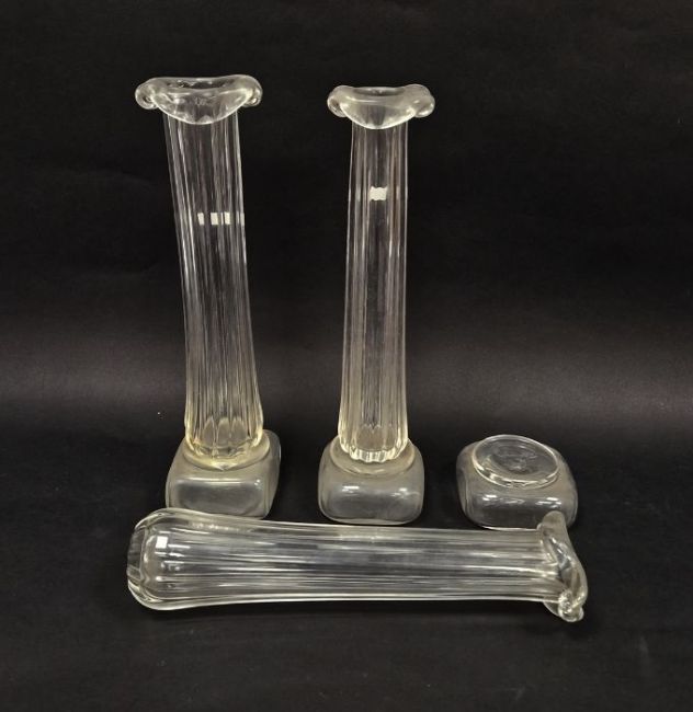 Three Patrick Stern clear glass vases in the form of columns on plinth bases, each signed to base, height 36cm, and a Harrachov Czech clear glass 'Harrtil' bowl/ashtray with white lattice pattern, diameter 13cm (4)