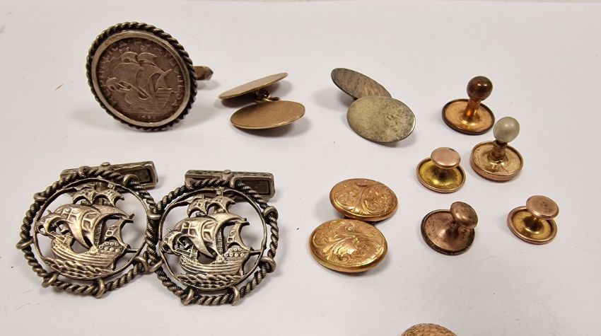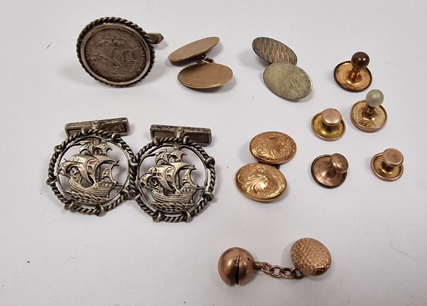 Sundry gold single cufflinks and collar studs, and a pair of silver-coloured metal ship-pattern cufflinks