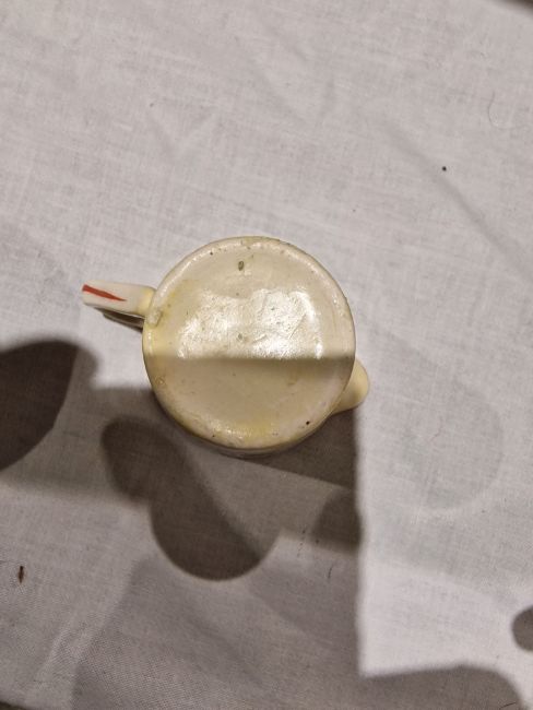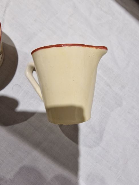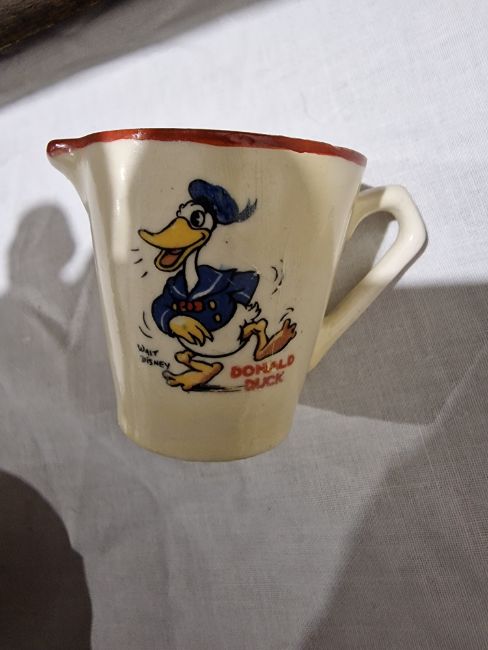 Wade Heathware Walt Disney Mickey Mouse pottery miniature tea set, printed black marks to teapot, variously printed with Disney characters, comprising a teapot and cover, a milk jug, a sugar bowl and four conical teacups and saucers  Condition Report Donald duck jug appears have to been repaired and the paint colour is different to the rest of the pieces.The Pluto bowl has a paint smudge.Most pieces have crazing and gilt loss.Please see attached further images.