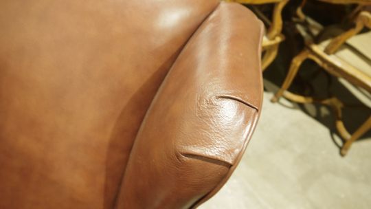 Brown leather two-seater 'Southwold' sofa and two armchairs by Laura Ashley Home, sofa 165cm x 92cm x 90cm (3)  Condition Report In the first picture the left cushion on the sofa is sideways.Wear to castors and some chips and scratches to the legs. Some creases to the leather. Scratch to the lower leftt side of one armchair and the upper left side of the other. Discolouration to upholstery pins.