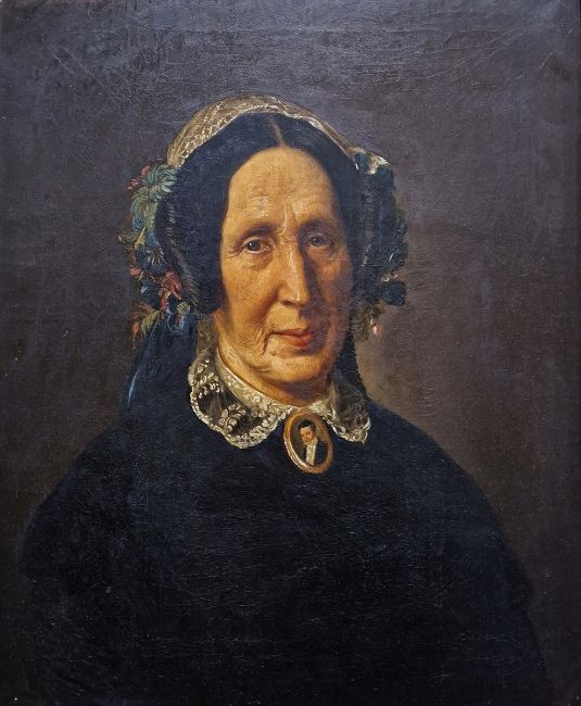 19th century school Head and shoulders portrait of a young man, 51cm x 41.5cm  19th century school Oil on canvas Head and shoulders portrait of a woman in lace cap and with portrait locket, 52cm x 42cm  Condition Report Please see further images attached.
