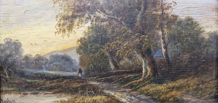 H Graham  Pair oils on canvas  Autumnal woodland lakeside scenes with female figure and sheep, signed, 32cm x 59cm (2)