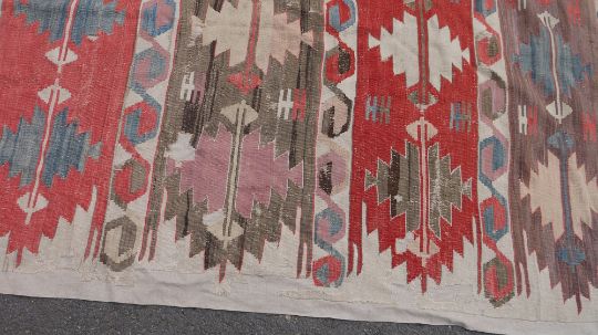 North-West Persian/Caucasian kilim runner woven with geometric bands in red, blue, purple and cream (damages and repairs), 358cm x 168cm
