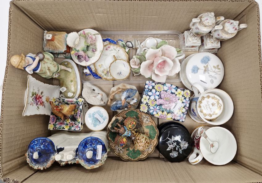 Assorted British and Continental pottery and porcelain, 19th century and later, including a Staffordshire pottery model of a turreted building, a pair of Dresden-style miniature vases and covers, a small Staffordshire cottage money box, a Continental porcelain blue and gilt doll's tea service, a Crown Staffordshire bone china candlestick, assorted bone china mugs, trinket pots and other items