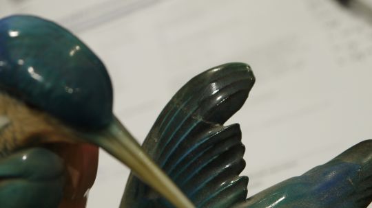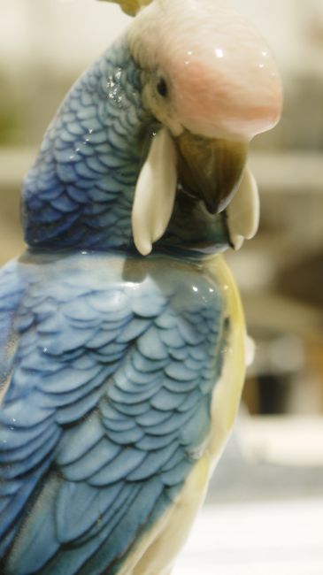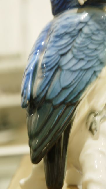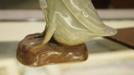 Collection of Karl Ens porcelain models of birds, including kingfishers, parrots and owl, printed blue and green marks, impressed numerals, owl 25.5cm high, and five Chinese export-style models of ducks, celadon glazed, impressed seal mark to larger and medium sized example, larger 28cm high (12) Condition Report Pink, yellow and blue parrot - Two losses to crest as well as a further glued section. Small chip to leaf on base.Blue and yellow parrot - Large cracks through body. Graze to end of one wing. Marks to leaf on base.Kingfisher group - Repair to wing of lower kingsiher as well as a chip to the end of its beak.Pink and grey parrot - Repair to crest. Some crazing to base and parrot's breast.Owl - repair to leaves on base. Small moulding error to neck.Orange breasted kingfisher - Crazing to base.Pink breasted kingfisher - Crack to base and marks. Some missed paint.Ducks - Some light surface wear and minor imperfections throughout. Smudged eye to smallest ducks.Please see additional pictures.