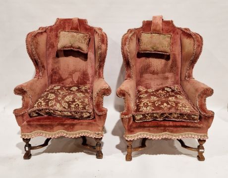 Pair of William & Mary-style upholstered wing back armchairs, each upholstered in dusty/faded pink velvet, with drop-in cushions and headrest, on gadrooned front legs joined by reeded X-frame stretcher, on scroll feet, 140.5cm high (2)
