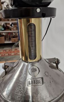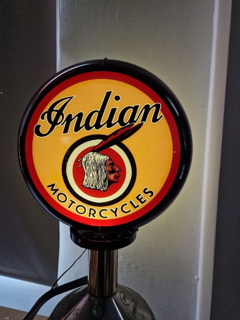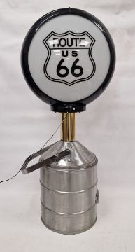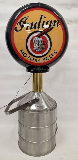Indian Motorcycles advertising floor lamp, with circular printed plastic top on brass and white metal 20 litre petrol can base of cylindrical form, with swing handle, 92cm high (electrified)
