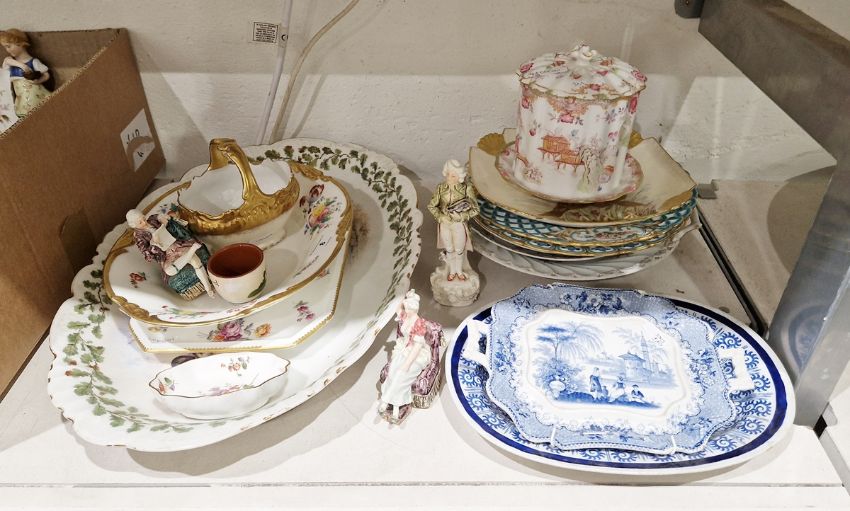 Collection of 19th century English and Continental pottery and porcelain, including two Minton pierced dessert plates with turquoise borders, one painted with a wooden vignette, a pair of Nymphenburg pierced dessert plates painted with flowers, a Dresden porcelain two-handled spirally moulded cake plate, a French porcelain shaped oval serving dish painted with water fowl, a Spode stoneware oval blue and white dish, assorted Royal Dux figures in the 18th century style and other items