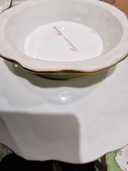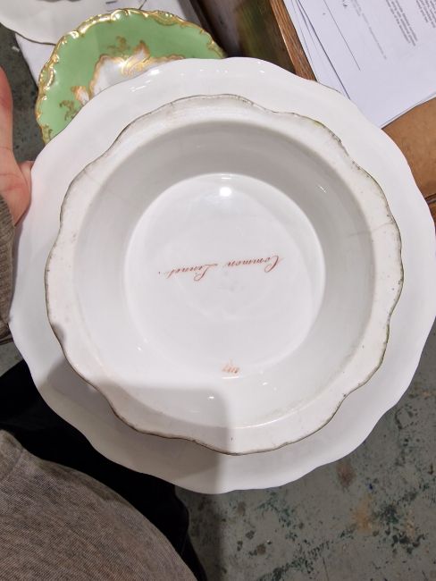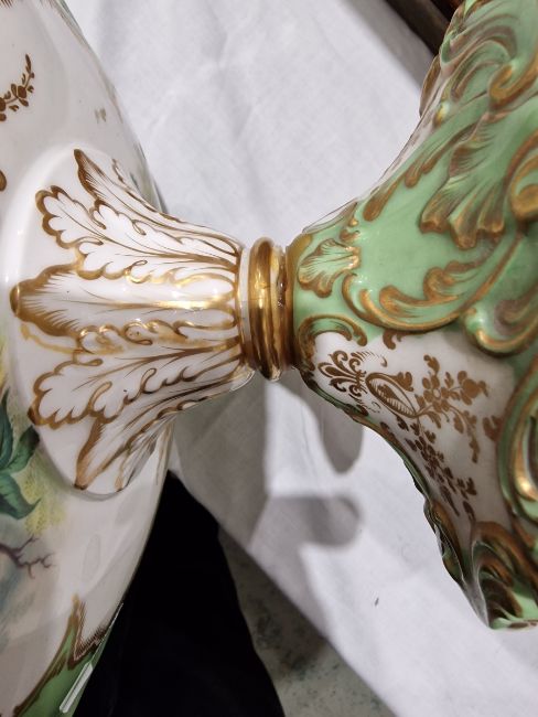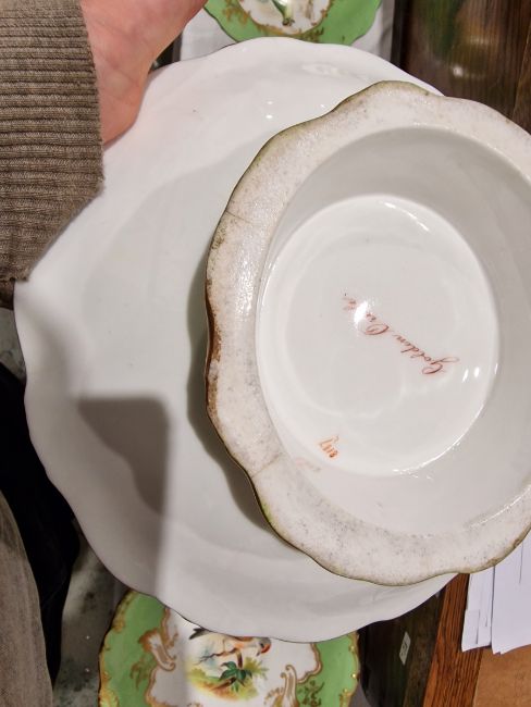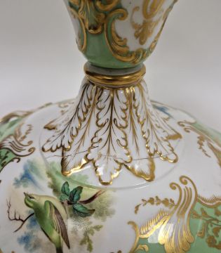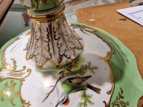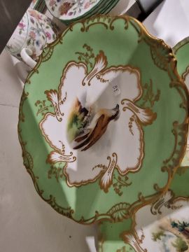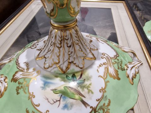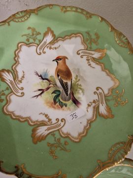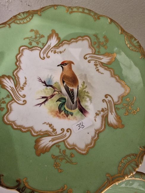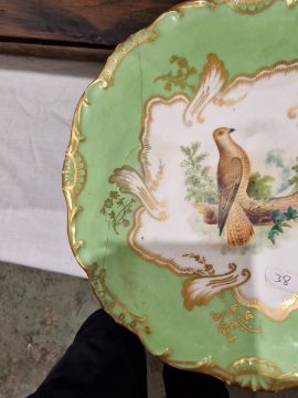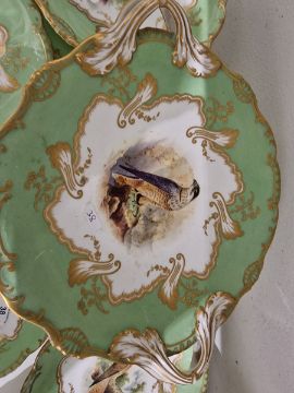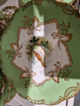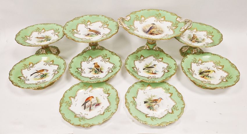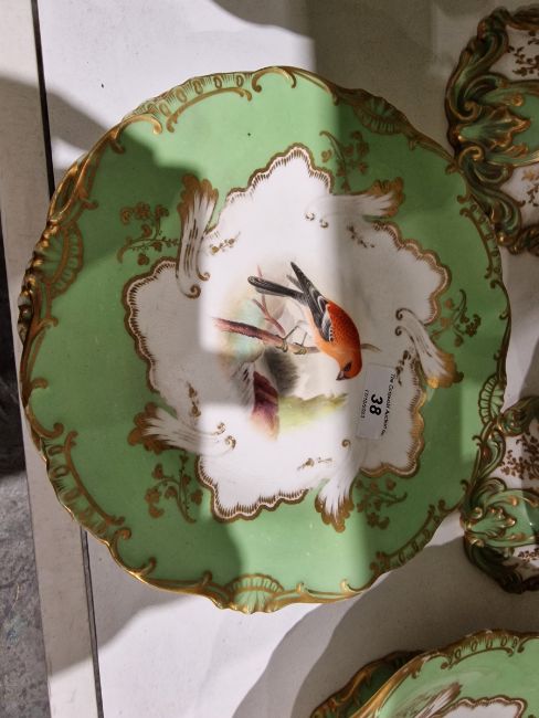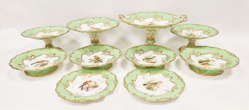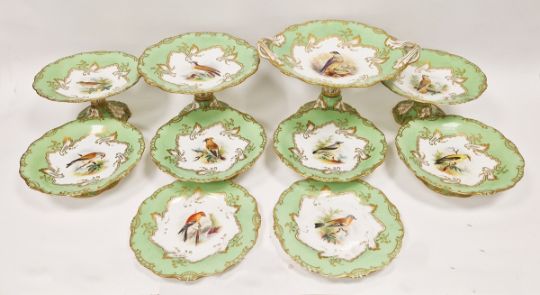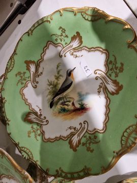 19th century English porcelain ornithological green ground dessert service, each painted with a specimen bird perched on a branch, titled in iron red to reverse, within gilt scroll cartouches and green borders, comprising a two-handled footed comport (cracked and repaired), one medium sized and two smaller comports (one cracked and repaired), four low footed comports and two plates, iron red pattern no.8187 Condition Report Four low footed comport - One cracked to base and to rim. Others all small cracks to bases.Large comport - cracked and repaired.smaller comports- One snapped of base and repaired, other cracked and repaired.plate- crazing to underside.Most pieces have wear and minor loss of pattern in spots.Please see attached images.