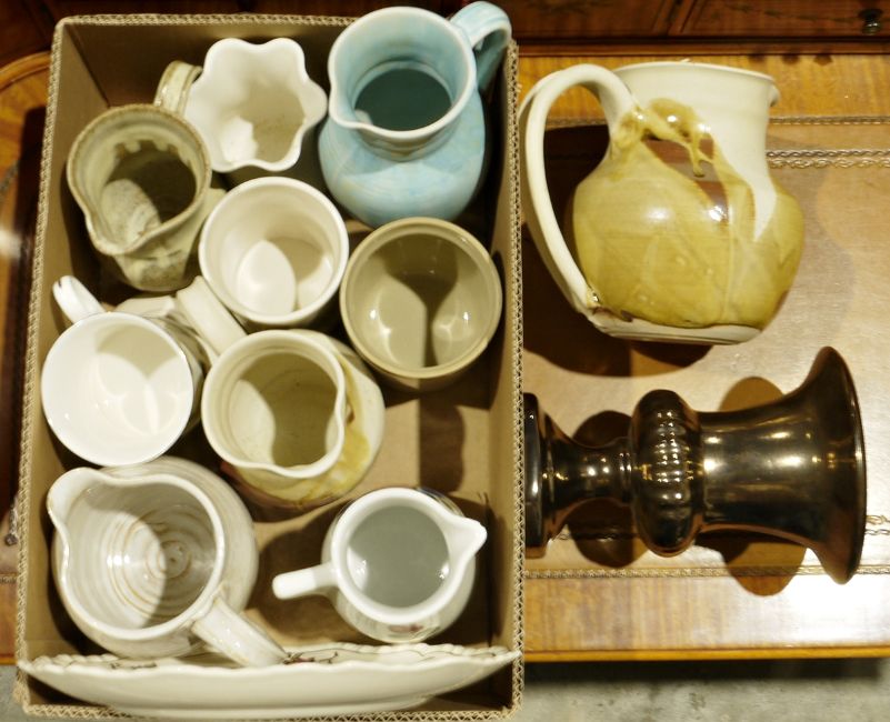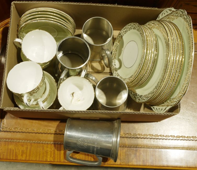 Assorted ceramics to include a studio pottery water jug, a silver lustre vase in the form of an urn, various mugs, seriesware, pewter tankards, Adderley fine bone china part tea service, a Myott floral decorated cake plate (3 boxes)