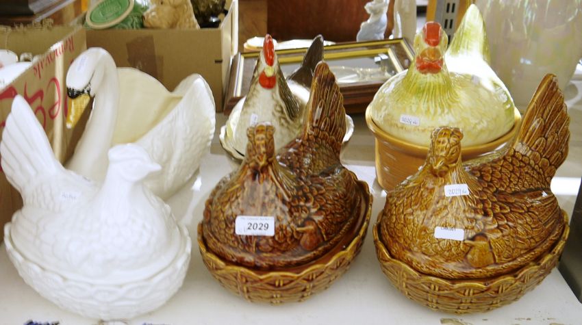 Collection of ceramic egg baskets modelled as hens sitting on baskets and a ceramic swan vase