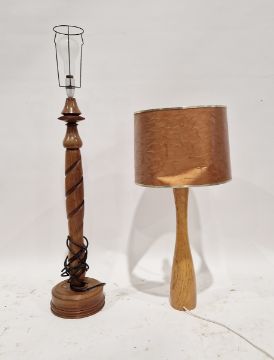 Two Mid century turned wood table lamps with matching textured shades (2)