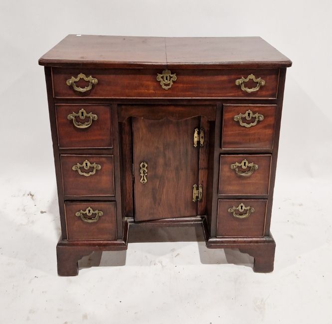 Georgian mahogany kneehole desk/dressing table having a central long drawer raised over a single concealed drawer and a single door cupboard, flanked on either side by three short drawers, each with brass handles and escutcheons, raised on shaped bracket feet, 78cm high x 76cm wide x 43cm deep