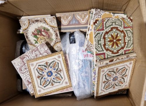 Large collection of fireplace tiles, late 19th/early 20th century including Minton examples, various moulded marks, printed brown registration numbers, variously transfer-printed in colours with Aesthetic Movement foliate designs, a section of encaustic-style frieze tiles and a large collection of Turkish Altra Kutahya tiles glazed in turquoise and blue with star motifs, in sizes and other items (1 box)