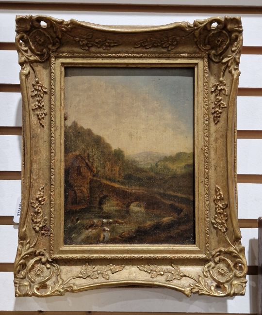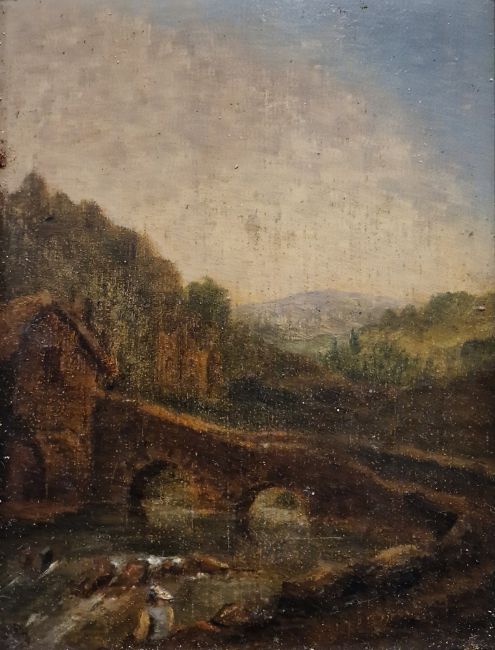 Rural scene with figure seated on river bank next to a bridge and mill, unsigned, 20.5cm x 15cm, together with an oil on panel depicting a farmyard scene with cockerel and chickens, signed Rirsma?, 12.5cm x 17.5cm (2)
