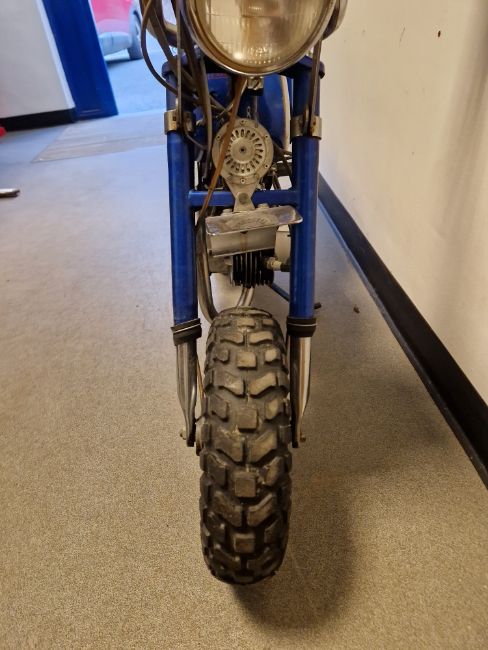 Vintage petrol Benelli mini bike made in Italy, with chrome and blue tank and chrome decoration throughout (currently untested), 125cm long