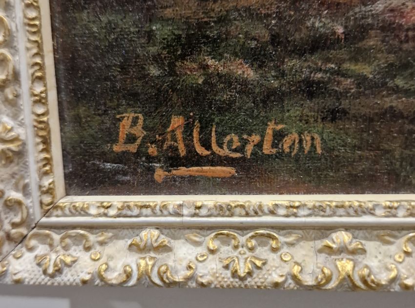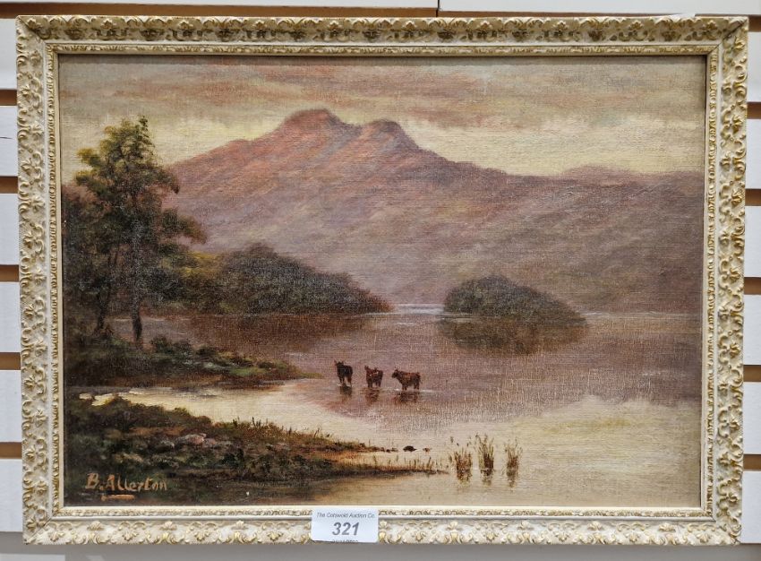 B Allerton Oil on board Cattle standing in water at lake shoreline at sunset, mountain in distance, signed lower left, 24.5cm x 34.5cm