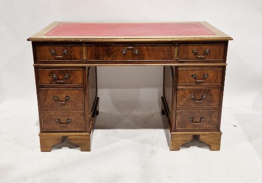 Late 19th/early 20th century mahogany twin pedestal desk with gilt tooled red leather inset top, having one long drawer flanked on either side by four short drawers, raised on bracket feet, 80cm high x 122cm wide x 60cm deep