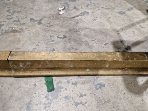 An early 20th century brass extending club fender upholstered in a burgundy leather fabric with button decoration, measuring approx 135 cm wide in current form  - maximum width 143 cm, 129cm internal at base Condition Report Seat hight 51cm, external depth 41.5cmRequest: Internal min and max measurements (only)Internal depth 35.5cm approx., internal width (extended) 150cm approx., (unextended) 120cm approx.Oxidisation to brass, some areas of corrosion, pitting, surface marks scuffs and some dents. Upholstery with scuffs and marks, some tears to corners. General wear and tear.