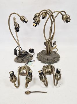 Two Art Nouveau-style bronzed metal table lamps, one twin light and the other five light, each cast as lilies issuing from lilypads (electrified) and a pair of twin light wall sconces, similar