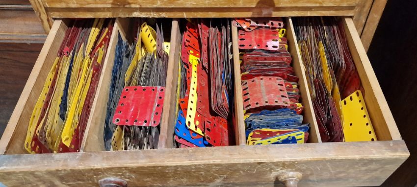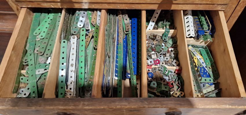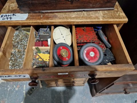 Large quantity of Meccano in tall narrow pine chest of nine short drawers, having turned wood knob handles and a small quantity of Meccano in a stained pine box with lift-up top (2)  Condition Report Request: Dimensions of the tall chest (only).Approx. dimensions H 122.5cm x W 56.5cm x D 39.5cm