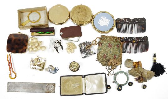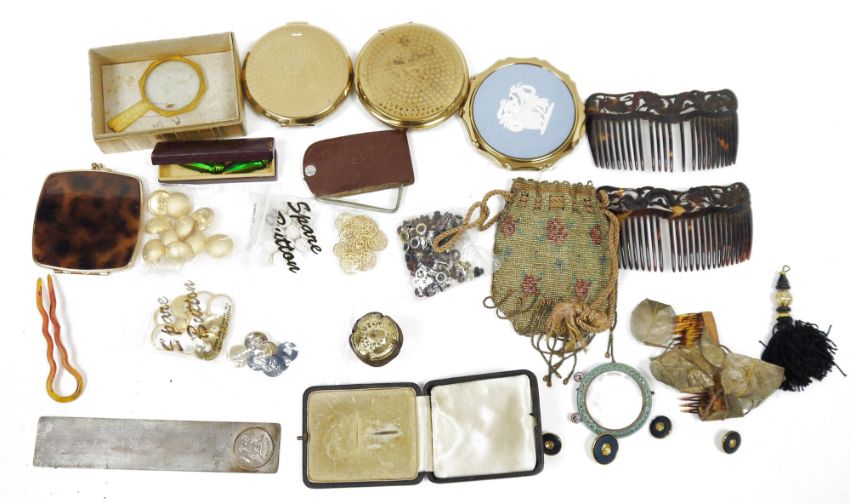 Assorted vintage compacts including Stratton, a Victorian beadwork purse, an early 20th century micro-mosaic small picture frame, assorted vintage buttons and eyelets, an American armorial bookmark, stamped CQ925, two dragon carved tortoiseshell-style hair combs and other items