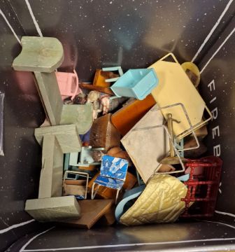 Quantity of sundry wooden, plastic and metal dolls house furniture, principally mid 20th century (1 box)