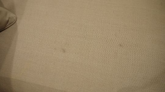 A contemporary grey upholstered three-seater sofa with four additional cushions, raised on metal castors, measuring approx 75 cm high by 190 cm wide by 100 cm deep Condition Report Some wear throughout to include frayed threads, stains, scuffs and scratches to feet and castors. Label to right rear foot reads "C & G Ayres LTD."