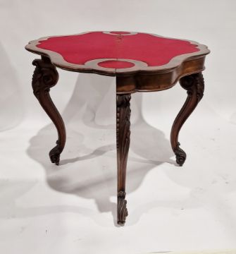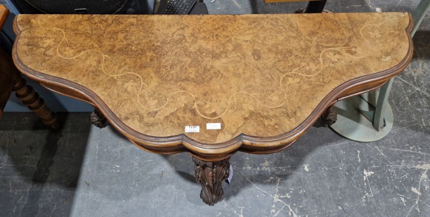Pair of Victorian burr walnut folding card tables, each with ogee shaped top and floral scroll marquetry, raised on scroll carved cabriole legs, the two tables combine to make a dining table, 76cm high, 128cm wide, 47cm deep (unopened)