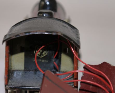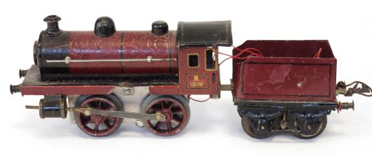 Märklin O gauge 0-4-0 locomotive No. R 11970 with four wheel tender in red and black lined livery (possibly repainted)