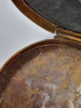 20th century Chinese cloisonne enamel lidded trinket pot of oval form, scene to the lid of a cockerel and chicken, 9cm wide, together with a pietra dura hinged pill box Condition Report Light surface marks, accretions. Minor pitting and imperfections to cockerel pot and small chip to the interior enamel Some tarnishing to brass.Pill box with light surface marks, accretions, possible tiny crack to base but could be the patternation of the polished stone. Tarnishing to metal.Both with general wear and tear.