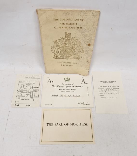 Collection of Queen Elizabeth II coronation ceremony related items, to include programme, ticket addressed to the Earl of Northesk and other related paperwork