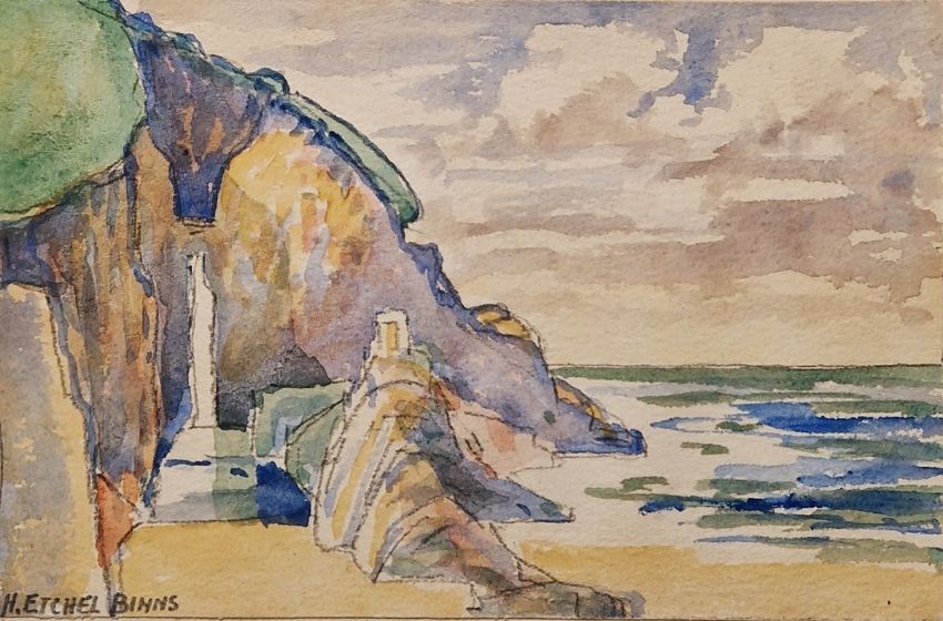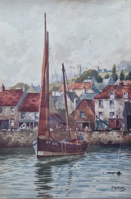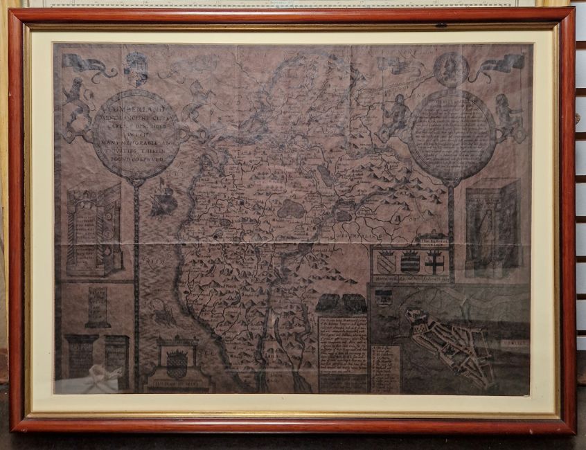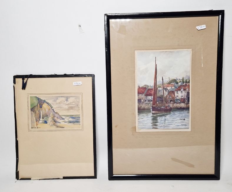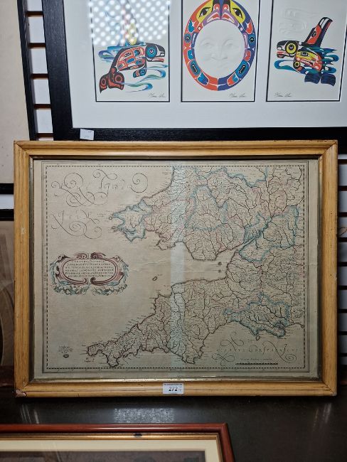 Reproduction of an old engraved map of South Wales and South West England and a map of Cumberland, a small watercolour of Cornish coastal scene by H Etchell Binns and a colour print of fishing boat (4)