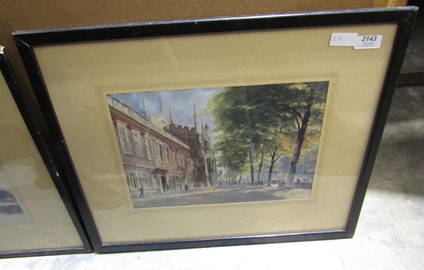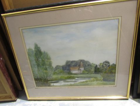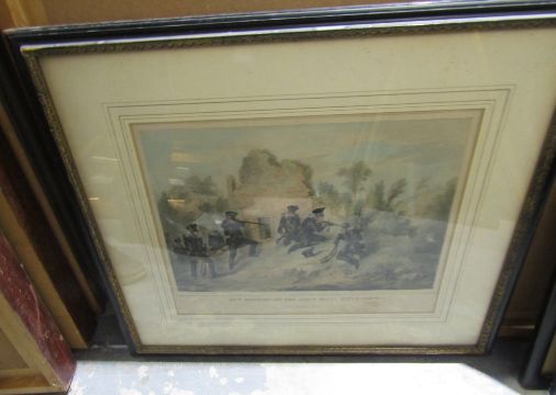 Framed print after M.A.Hayes '60th Regiment ( or The Kings Royal Rifle Corps) Heavy Marching Order,'  published by W. Spooner 377 The Strand, watercolour drawing 'Church in rural setting' signed lower right Y or V Powell - ( possibley Stoke Charity Church Hampshire) two framed prints ' Windsor Castle from the water meadows' and 'Street Scene ' ( possibly Eton)  ( 4)