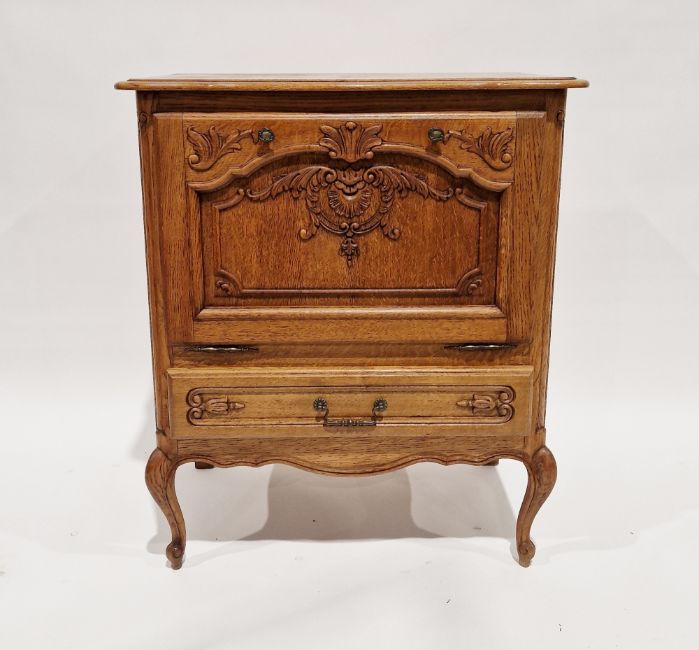 Contemporary oak storage cupboard, the fall front opening to reveal a storage compartment with mirrored back, raised over a single long drawer, on cabriole legs, 95cm high x 80cm wide x 46cm deep