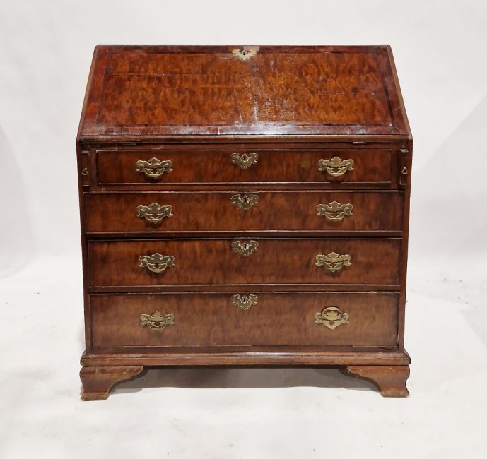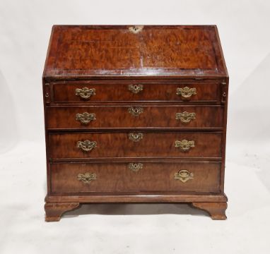 A Georgian mahogany bureau, the full front opening to reveal a blue gilt leather inset top and an assortment of fitted drawers and pigeon holes, raised over four long graduated drawers, each with brass handles, raised on bracket feet, measuring approx 108 cm high x 100 cm wide x 52 cm deep