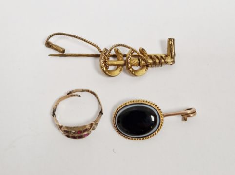 9ct gold bar brooch, horseshoe and crop (damaged), a gold-coloured metal and onyx brooch (damaged), and an antique 9ct gold, pink stone and pearl ring (damaged) (3)