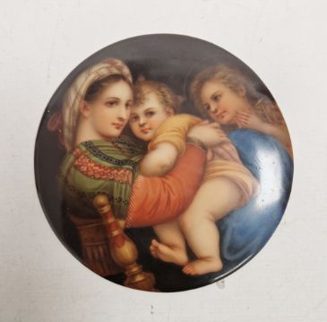 Italian (Florence) porcelain circular plaque, late 19th century, printed fleur-de- lys/Firenze mark, incised 100, painted with the Madonna Della Seggiola after Raphael, 15.5cm diameter