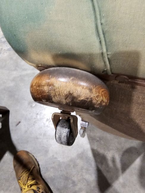 There is some wear to the fronts of the feet. The upholstery on the bottom is coming loose. There is extensive wear and fading to the upholstery on the arms and to the back left. Please see attached images.