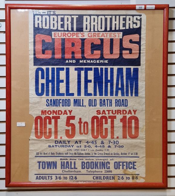 Vintage circus poster for Robert Brothers Circus and Menagerie, Cheltenham show at Sandford Mill, framed and glazed, poster size 74.5cm x 50cm