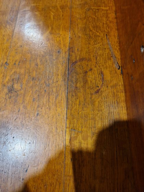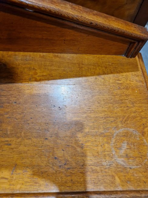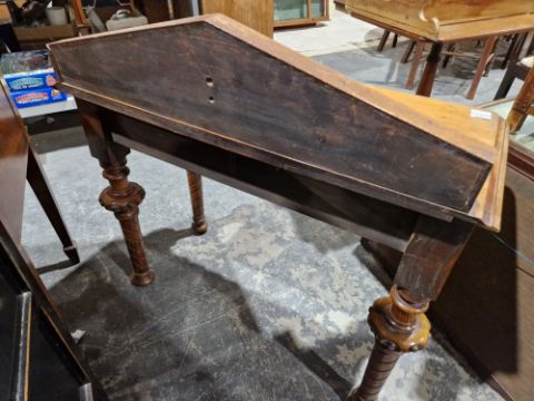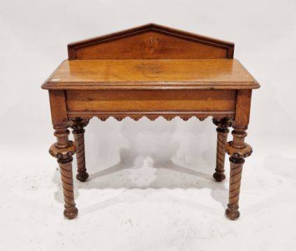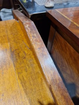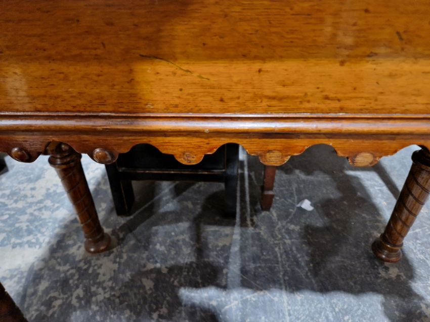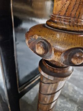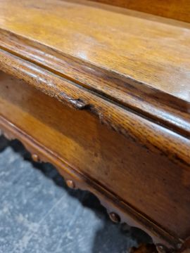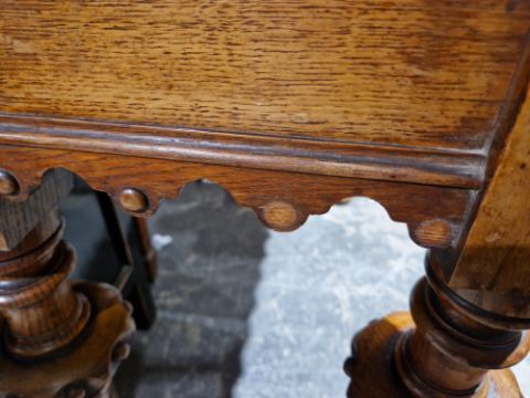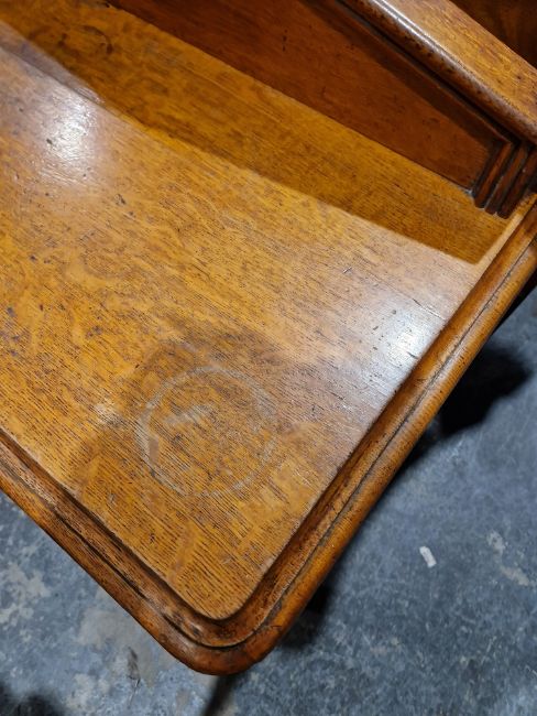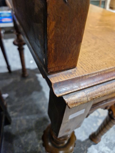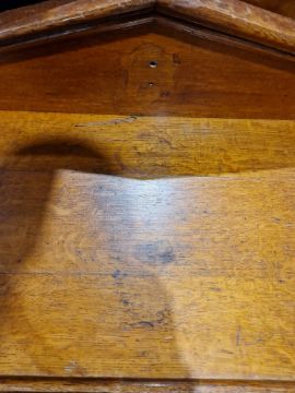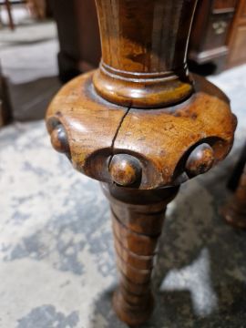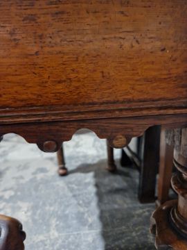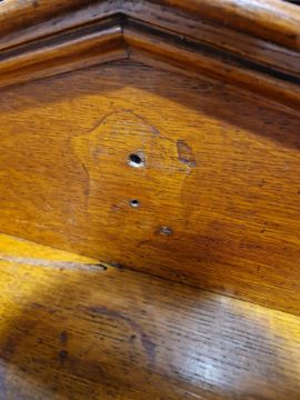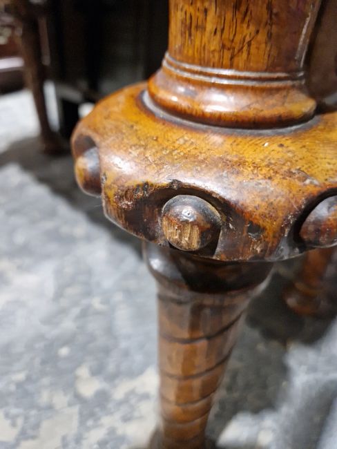 Height of table top - 71cm. Table with surface scratches, scuffs and knocks. Some fading and discolouration. Losses to the wooden discs on the frieze at front and both sides. Chip to moulding on front of table. Shield or armorial decoration missing from back section, which the back is slightly loose. General wear and tear.