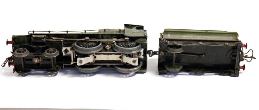 Hornby 'O' gauge tinplate Special No 2 'County of Bedford' 4-4-0 locomotive and Great Western six wheel tender, the locomotive with 4-4-0, GWR livery, no. 8321. Appears to have been converted from clockwork to 20V electric
