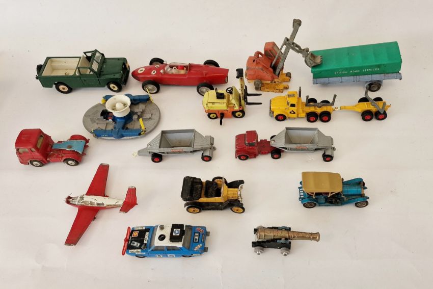 Quantity of playworn diecast model cars to include Corgi Toys Hillman Hunter, Corgi Major Toys H.D.L. hovercraft SR-N1, Britains L.W.B. Land Rover, Dinky Toys Conveyancer, etc