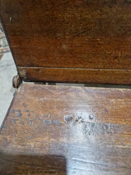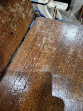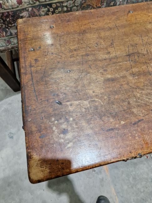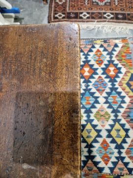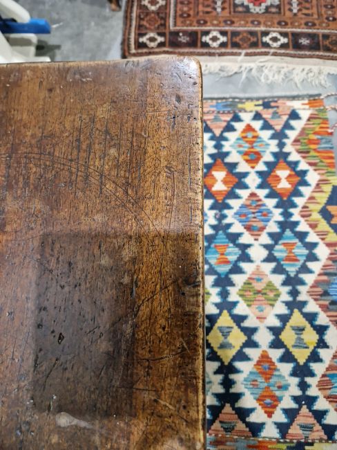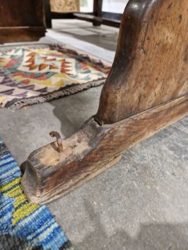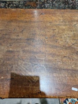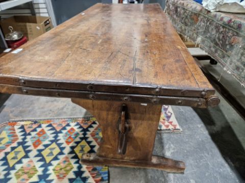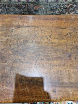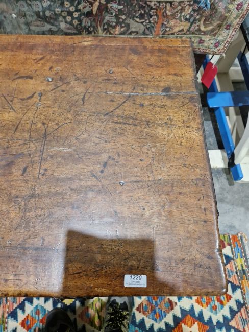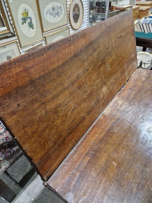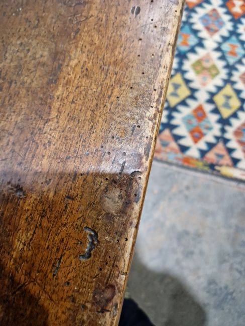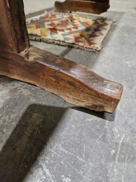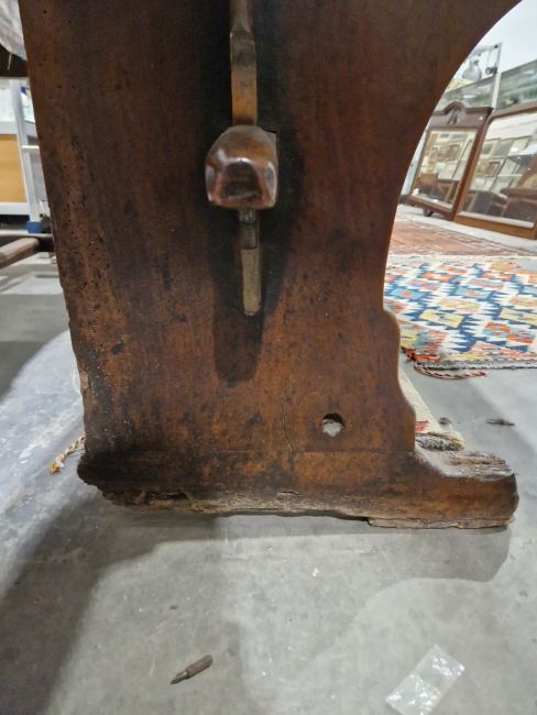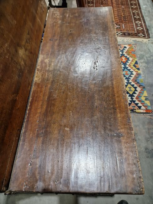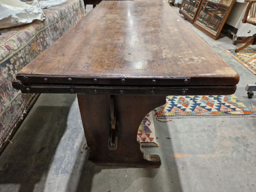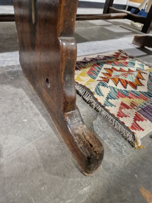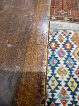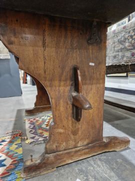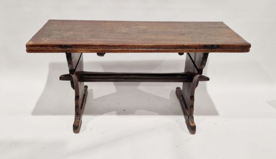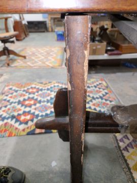 Circa 17th century Irish tavern table, the foldover top 141cm x 116cm (open), on trestle supports with peg joined straight stretcher (leg broken off) 71cm high, 144cm long, 78cm wide (unopened) Condition Report Surface scratches, scuffs and knocks. Areas of fading, discolouration and staining. Play in the joints, old worm in places. Top seperates from support on on end. Splits to the top. Section of leg broken off but present. General wear and tear.71cm high, 144cm long, 78cm wide (unopened)