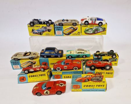 Quantity of playworn Corgi Toys with boxes (flap cut) to include 2 X 312 'E' Type Jaguar competition model, 2 X 314 Ferrari 'Berlinetta' 250 Le Mans, 155 Lotus-Climax Formula 1 racing car, 150S Vanwall Formula 1 Grand Prix, 309 Aston Martin Competition Model, 154 Ferrari Formula 1 Grand Prix racing car, 156 Cooper Maserati F/1, 330 Porsche Carrera 6, 328 Monte-Carlo 1966 (11)