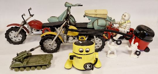 Tinplate model scooter, red and black painted model motorbike, Michelin man on bike and other models (1 box)