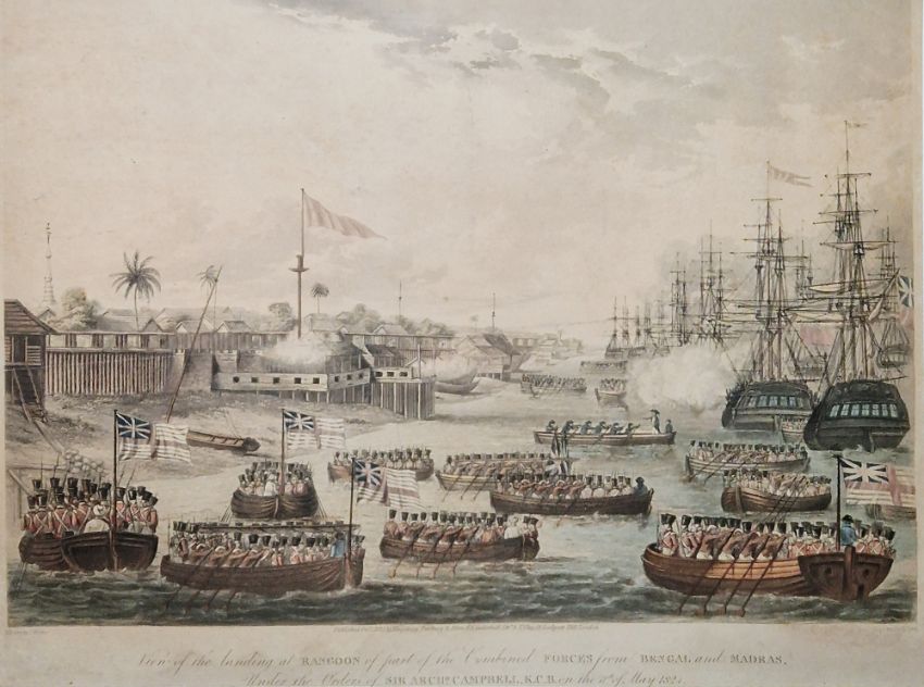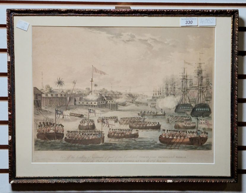 After Lieut. James Moore Coloured engraving "View of the landing at Rangoon of part of the combined forces from Bengal & Madras, under the orders of Sir Archibald Campbell KCB on 11th May 1824", engraved by H. Pyall  published Oct 1st 1825 by Kingsbury, Parbury & Allen, framed and glazed, image size 28cm x 37.5cm