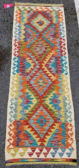Chobi kilim runner, woven with bold geometric lozenges in orange, red, blue and yellow, within geometric pattern border, 197cm x 68cm